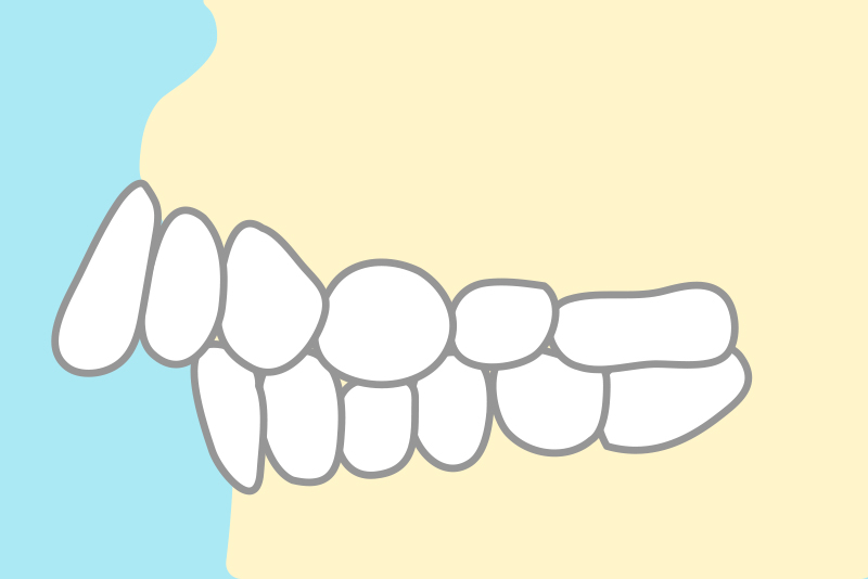 上の前歯や上顎全体が前に出ている状態です。前歯をぶつけやすく、転倒時に折れたり欠けたりするリスクが高まります。口が閉じにくく、口呼吸やお口の乾燥につながることもあります。